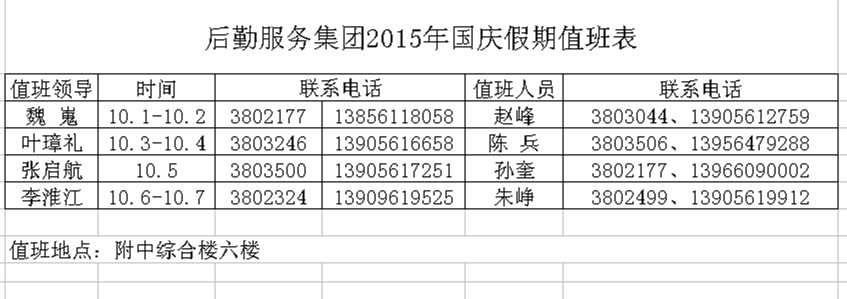 后勤服务集团2015年国庆假期值班表