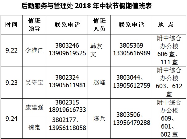 后勤服务与管理处2018年中秋节假期值班表